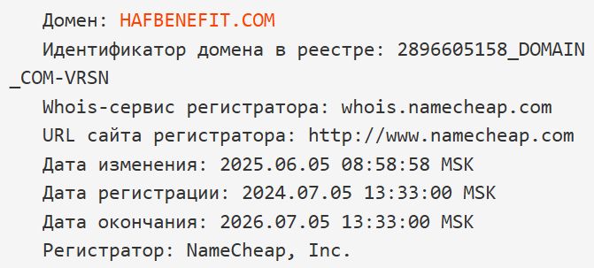 Сам домен hafbenefit com по данным WHOIS был зарегистрирован год назад, что не совпадает с легендой об основании компании в 2015-2017 гг.