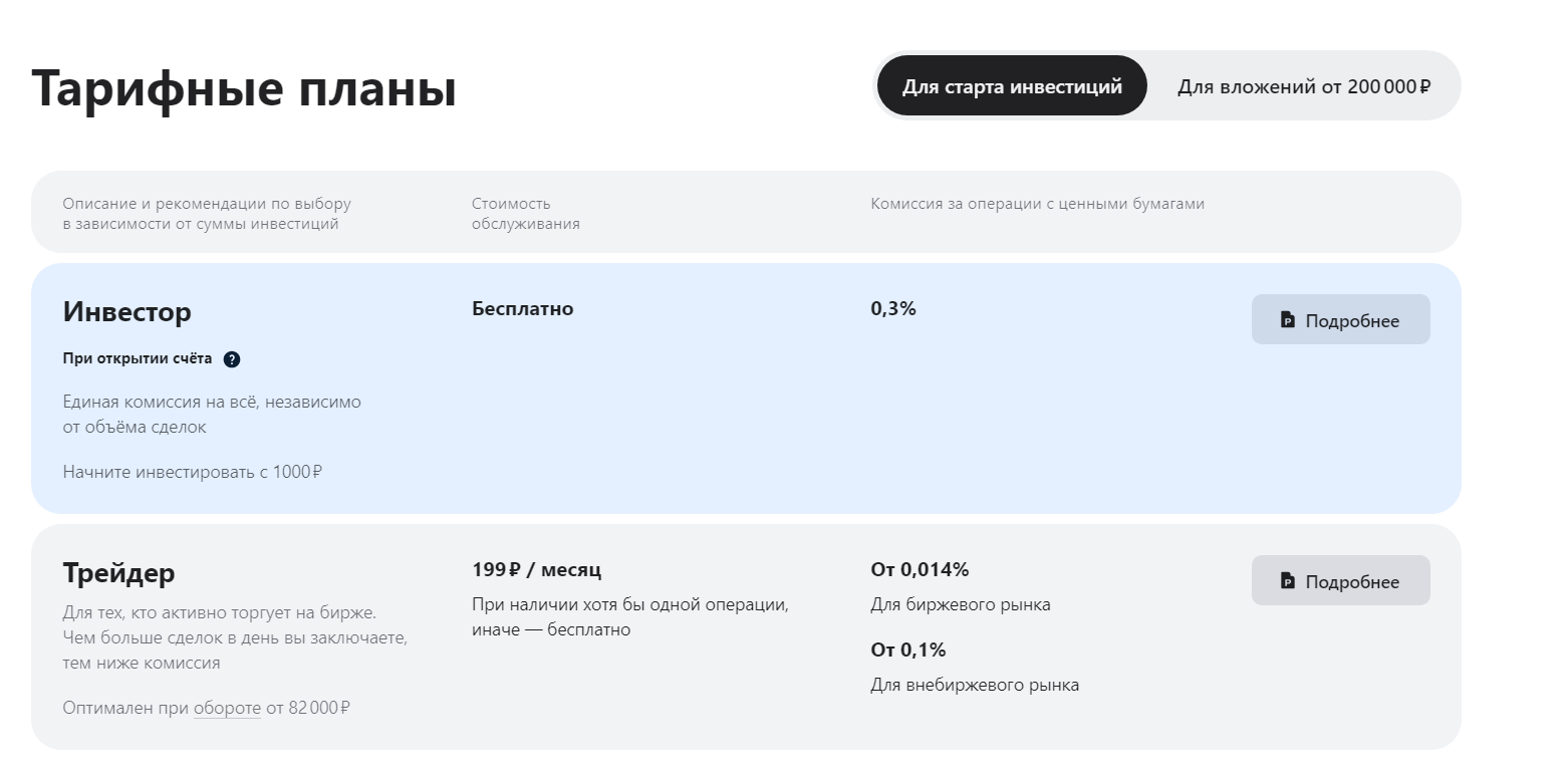 Стартовый тариф предлагает простую систему единой комиссии 0,3% за все операции с активами.