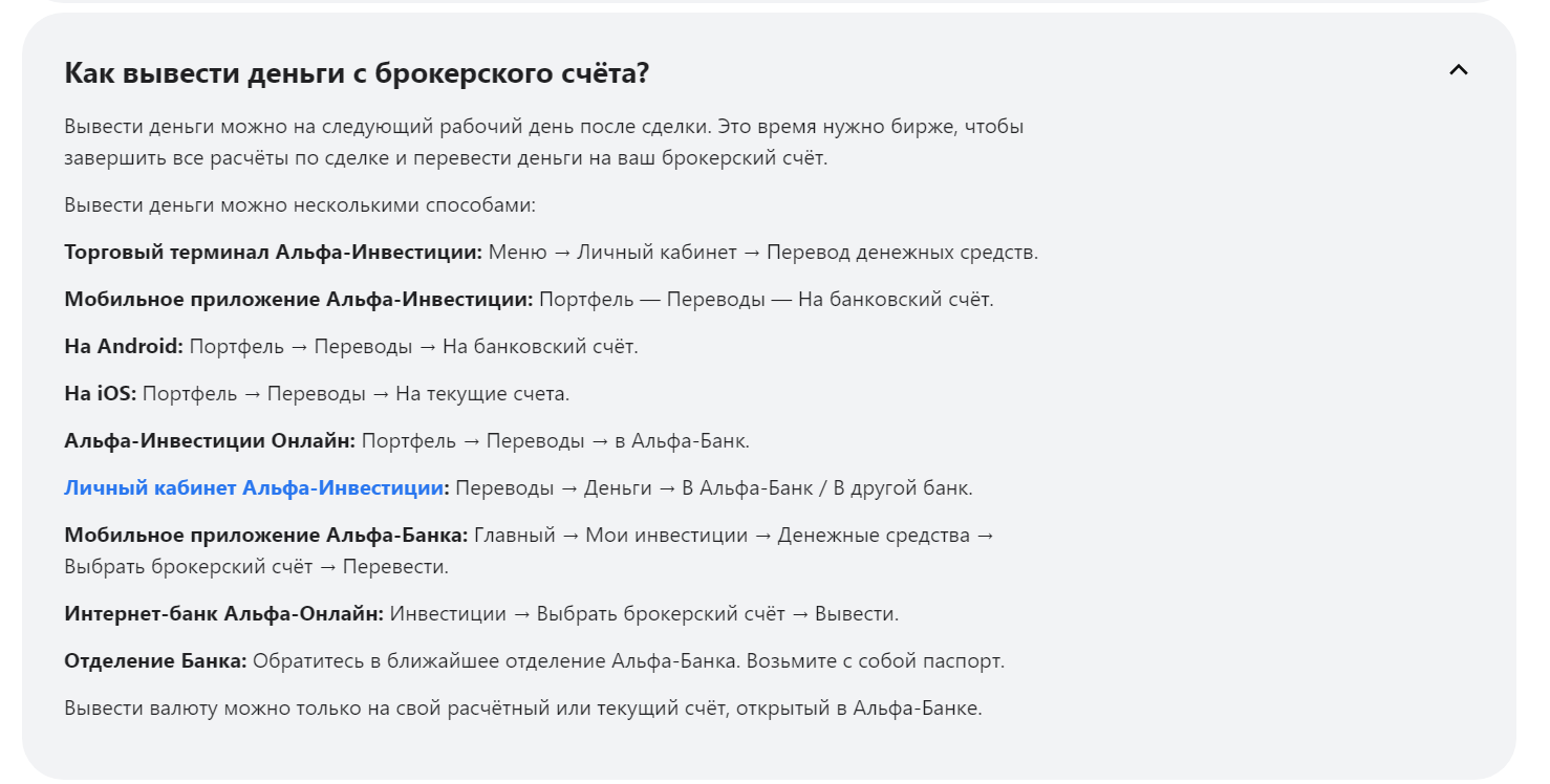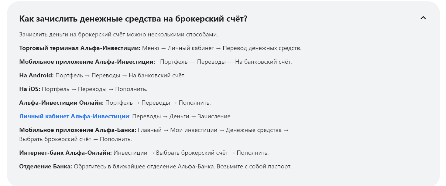 Внесение денег на счет аккаунта доступно множеством способов, включая наличные деньги через кассу отделений банка. Все переводы делаются только на брокерский счет клиента «Лк Альфа Директ ру трейд» с верифицированного источника. Это позволяет исключить мошенничество и вернуть деньги в случае ошибки.