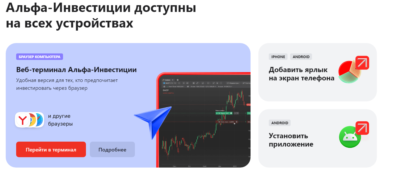 Для работы с терминалом Lk AlfaDirect ru trade можно использовать клиенты для мобильных устройств, а также любые браузеры.