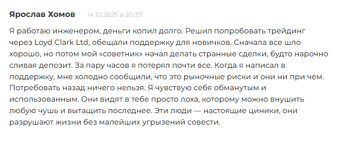 LoydClarkeLTD отзывы получает негативные. О блокировках аккаунта не сообщается, но пользователи жалуются на другие способы развода. Так пользователь Ярослав пишет об обмане со стороны консультантов, которые специально «сливают» прибыль клиента.