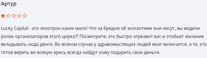 Пользователи оставляют о Lucky Capital негативные отзывы о том, что это лохотрон. Вдобавок к этому, клиенты финансового брокера по заработку на инвестициях пишут про отказ в выплатах.