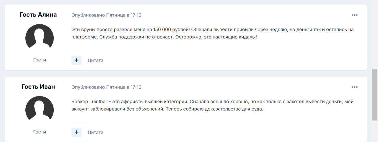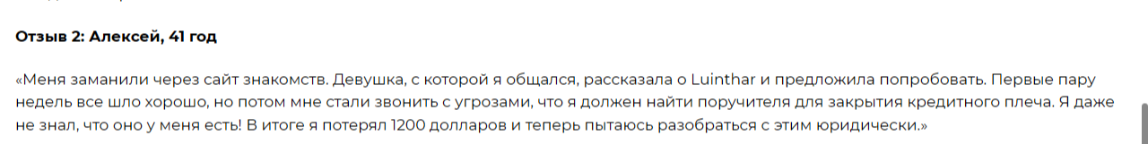 Луинтхар не демонстрирует на сайте отзывы благодарных клиентов. Возможно, потому, что их просто нет.