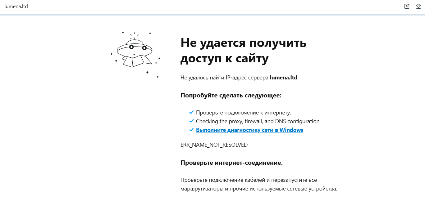 На 15 октября 2025 г. сайт lumena ltd недоступен, а браузер выдает “Не удалось найти IP-адрес”. Это значит, что домен не существует — он не зарегистрирован и не привязан ни к какому серверу. Не выводится ни владелец, ни дата регистрации, ни хостинг.