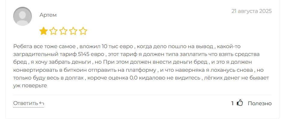 Один пользователь сообщил, что с него потребовали более пяти тысяч евро, чтобы просто разблокировать счет. Другие говорили, что даже после всех оплат доступ к деньгам не возвращался, а поддержка исчезала.