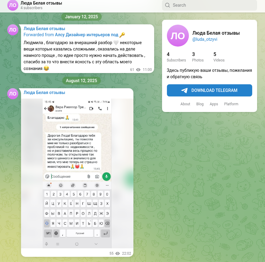 Люда Белая ведет небольшой авторский канал в Телеграме об инвестициях в недвижимость с живой аудиторией и содержательными эфирами. Биография автора выглядит насыщенно: маркетинговый опыт, бизнесы в медицине, статус квалифицированного инвестора с 2008 года. Но подтвержденных результатов работы с клиентами нет — ни проверяемых кейсов, ни независимых откликов, ни раскрытых цифр по сделкам.