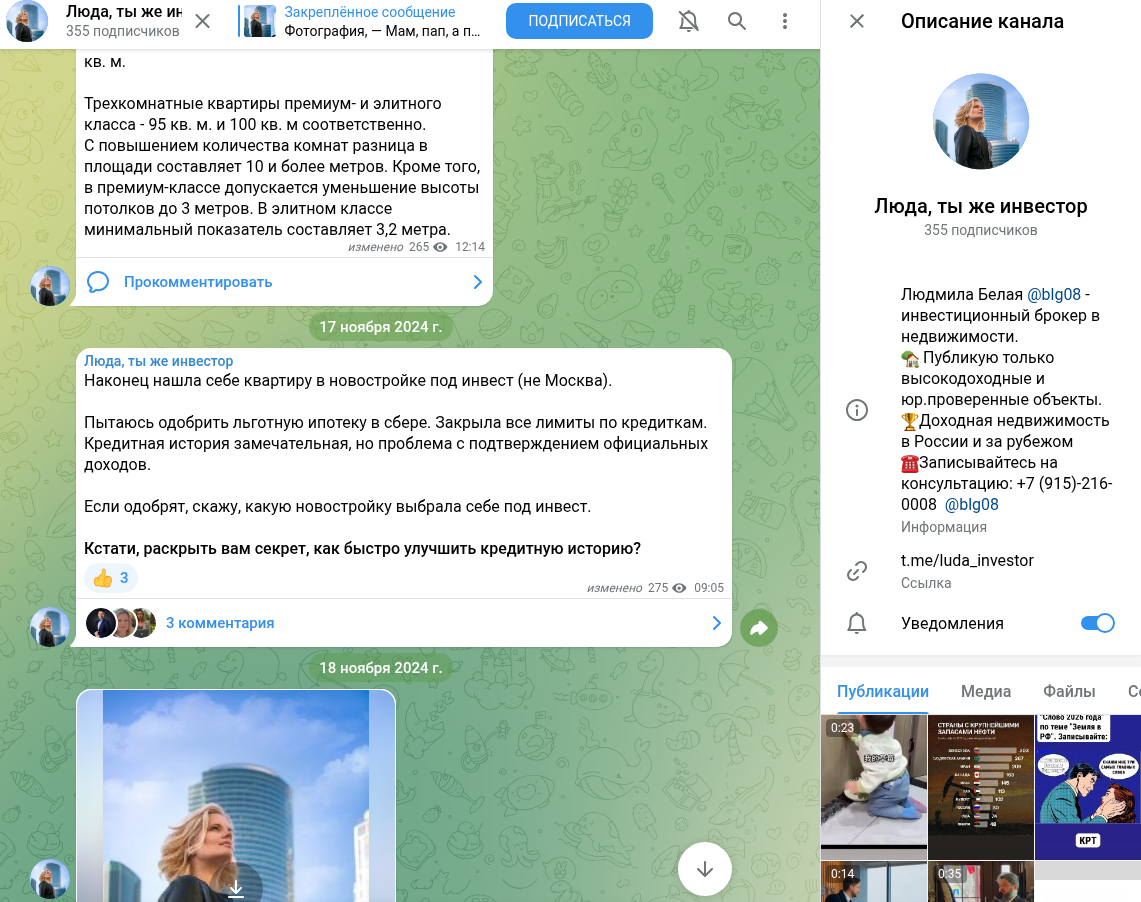 Создан в 2024 году, работает по ссылке @luda_investor. Людмила публикует юридически якобы проверенные объекты недвижимости с акцентом на высокодоходные варианты — в России и за рубежом. Дополнительно проводит консультации, на которые можно записаться по телефону +7 (915) 216-00-08 или через личку.