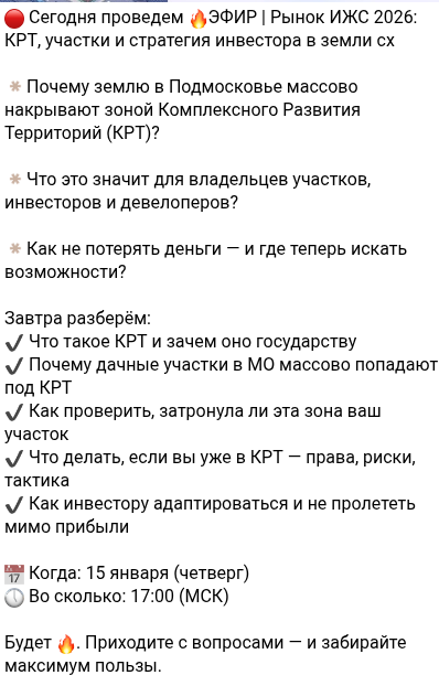 Помимо постов с объектами недвижимости, инвестор проводит прямые эфиры. Судя по анонсам, темы касаются актуальных изменений на рынке — например, зоны КРТ в Подмосковье и стратегии инвестора в земли ИЖС. Формат: разбор конкретных ситуаций с вопросами аудитории. Это заметно отличает канал от шаблонных витрин объектов без контекста.