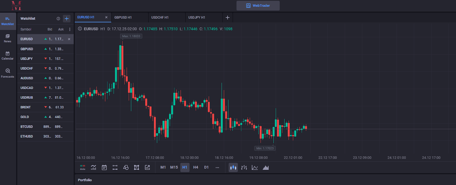 Биржа Mag Group разделена на три основные части. Trade Maggroup Digital – торговый терминал с графиками валютных пар. Здесь отображается баланс счета, доступны экономические новости и рыночные прогнозы. Дизайн выполнен в темных тонах.
