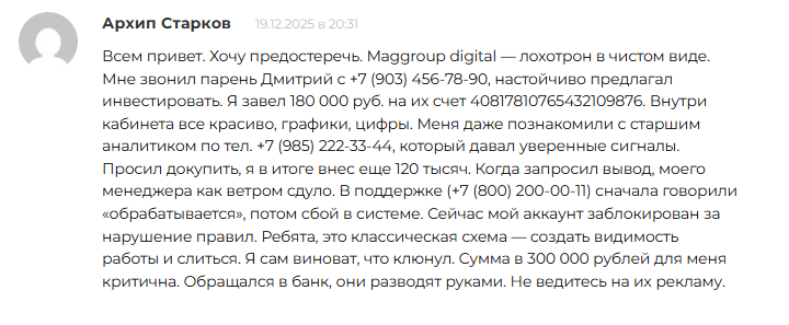 При попытке вывести деньги менеджер исчез бесследно. Поддержка сначала ссылалась на обработку заявки, затем на технический сбой системы. Финал предсказуем – брокер MagGroup заблокировал аккаунт за якобы нарушения. Клиент потерял все средства без возможности вернуть хоть копейку.
