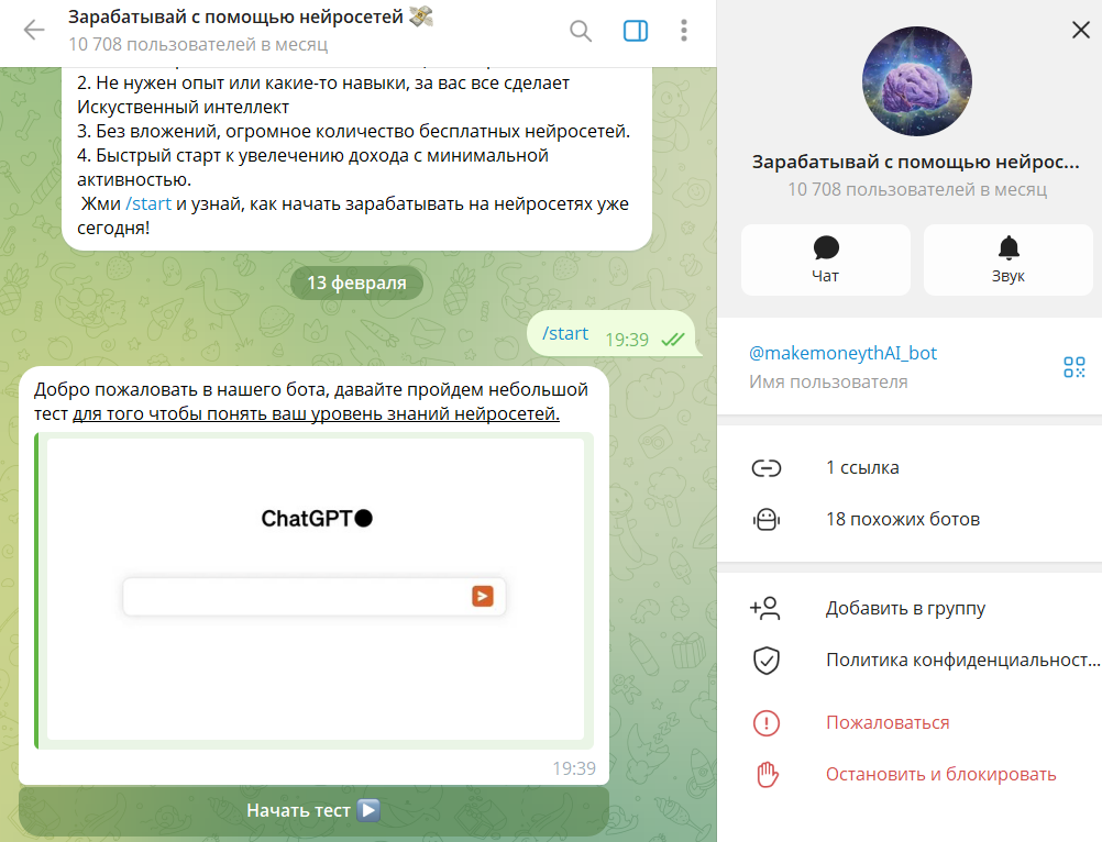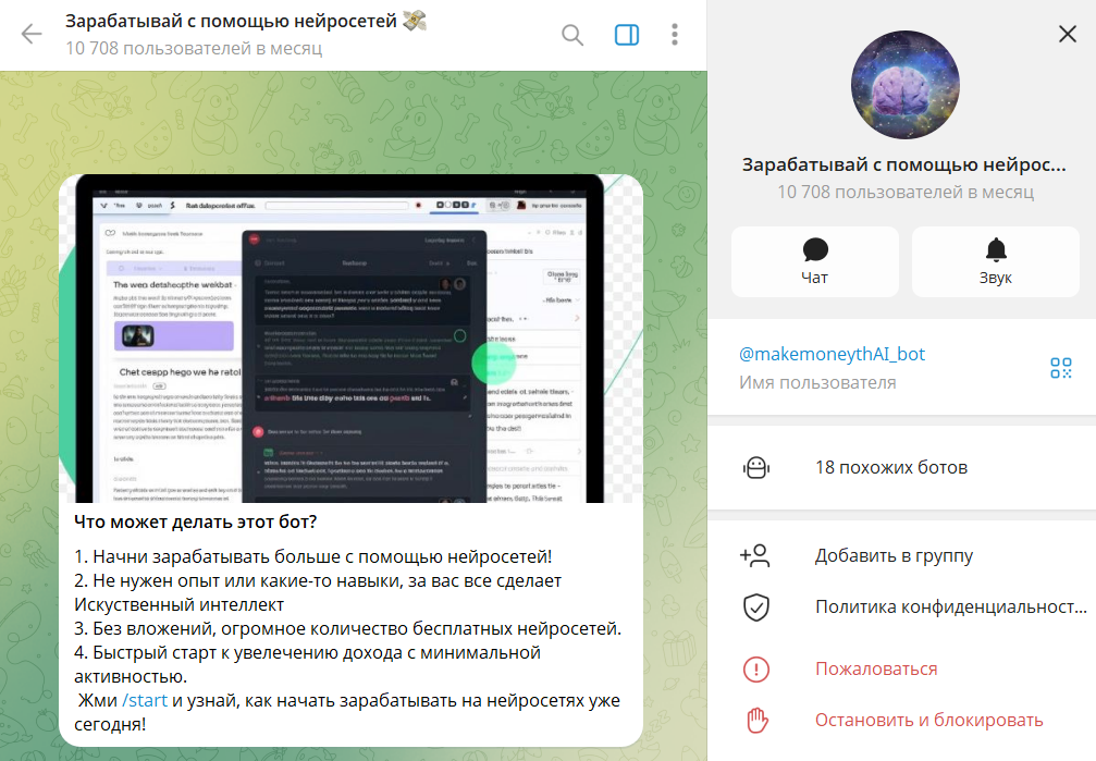 Вопрос о том, MakeMoneythAI Bot – обман или нет, может тревожить многих пользователей Телеграмм, ведь этот бот еще не успел обзавестись репутацией. Тем не менее разработчики преподносят его в качестве автоматического помощника для заработка денег с помощью нейросетей.