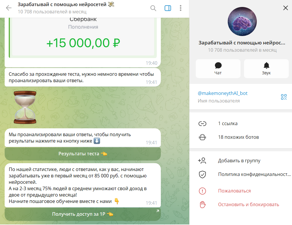 После прохождения теста сервис сообщает, что проанализировал ответы и выдает обобщенный результат. Обычно заявляется, что люди с похожими ответами начинают зарабатывать от ₽85,000 уже в первый месяц, а через 2-3 месяца якобы увеличивают доход вдвое. В конце бот «Зарабатывай С Помощью Нейросетей» пользователю предлагает получить доступ к обучению всего за ₽1.