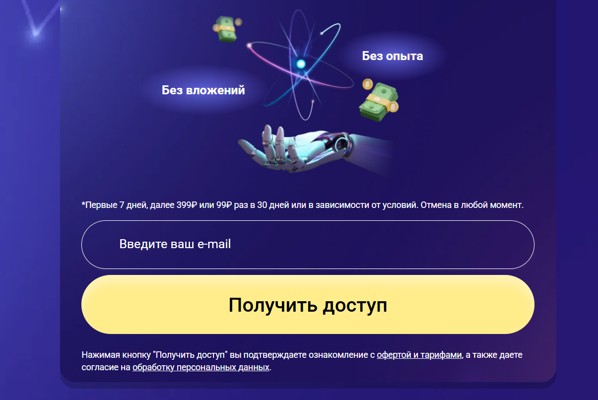 Чтобы получить доступ к обучению от Make Moneyth AI, пользователю предлагают ввести email, подтвердить согласие с офертой и обработкой персональных данных. Подробной программы курса, структуры модулей, информации об авторах обучения или конкретных примеров реального заработка на сайте не представлено.