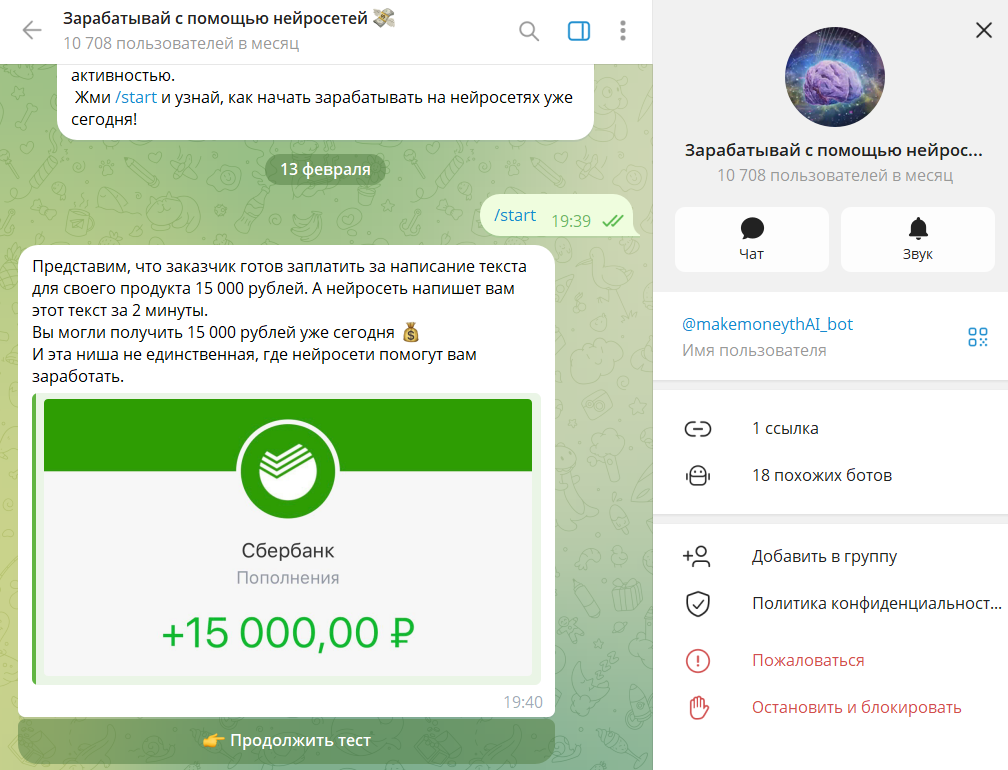 Далее бот демонстрирует пример якобы заработка, то есть присылает картинку с пополнением на ₽15,000, утверждая, что такой доход можно получить за написание текста с помощью ИИ всего за пару минут. При этом сервис Make Moneyth AI никаких реальных подтверждений выплат или конкретных заказчиков не приводит.