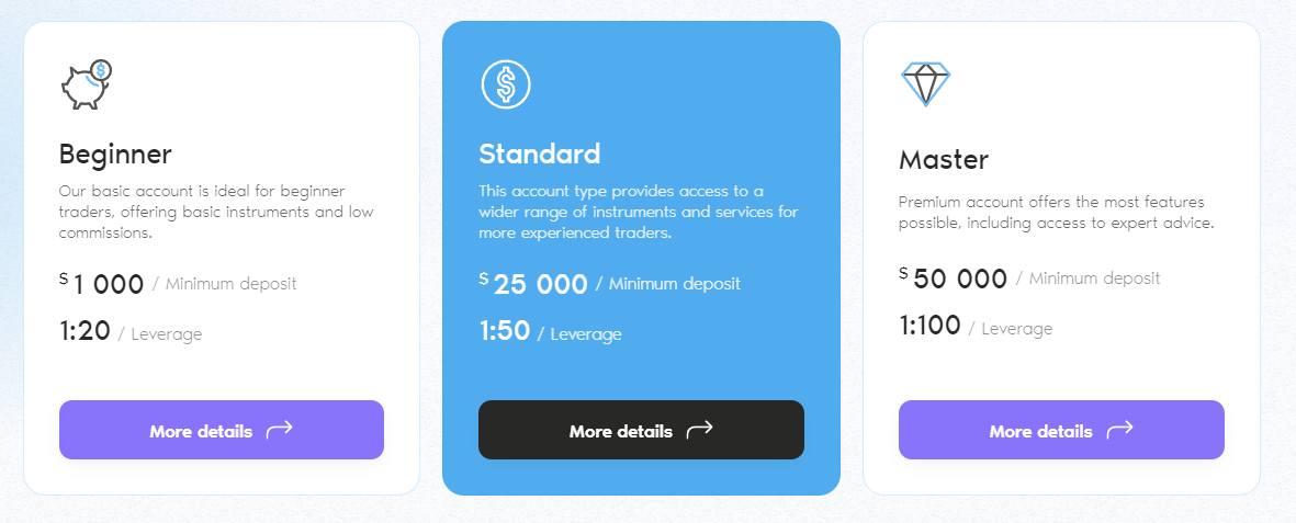 - Master. Минимальный депозит 50 тысяч долларов, а кредитное плечо 1:100. Вариант для профессиональных трейдеров.