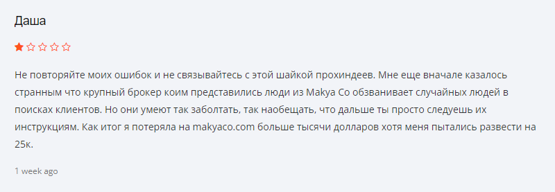 Мы не рекомендуем вам Makyaco Com. Если у вас уже был опыт в работе с ними, то мы просим вас делиться о нем в комментариях, чтобы другие люди имели больше представления о нем. На нашем сайте есть обзоры других брокеров.