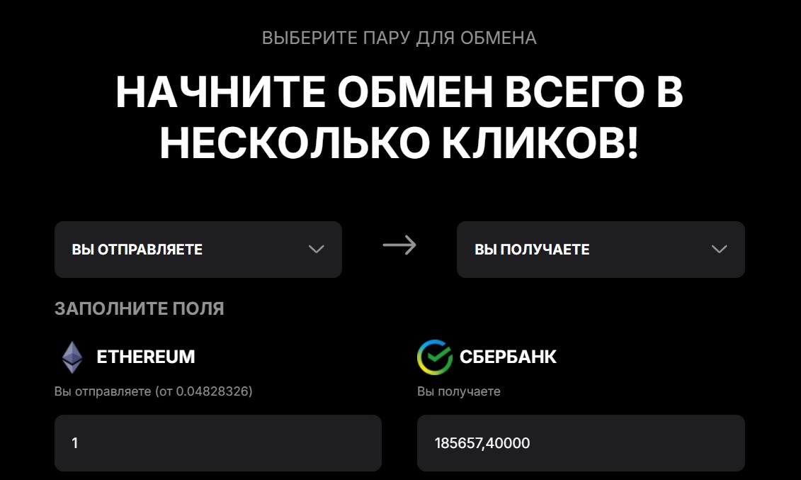 На главной странице сайта представлено 25 криптовалют, но где посмотреть остальные, неизвестно. Обменять их можно на «Сбер», «Т-Банк» и «Альфа-Банк», а курс Eth в начале апреля 2025 года составляет около 185 000 рублей.