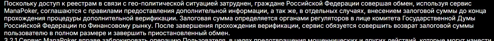 За обмен на проекте предусмотрена комиссия 1% от сделки, а что касается размера указанной залоговой суммы на обменнике «МанаПокер», о ней информации нет. О других услугах данные тоже отсутствуют, поэтому можно предположить, что владельцы зарабатывают только на дополнительных сборах с обмена.
