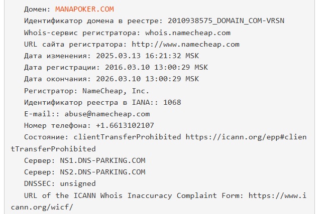Единственная ссылка на сайте, которая ведет на сторонний ресурс – аккаунт в Телеграмме для поддержки, но мессенджер пишет, что такого пользователя не существует. По информации с WhoIs ru, имя сайта зарегистрировали в 2016 году, но проверка через Web Archive показала, что в то время ресурс принадлежал какому-то проекту о покере.Если изучить информацию с сервиса WhoIs более подробно, станет видно, что в марте 2025 года в имя ManaPoker com внесли какие-то изменения, но обычно это происходит, когда домен покупает новый владелец.
