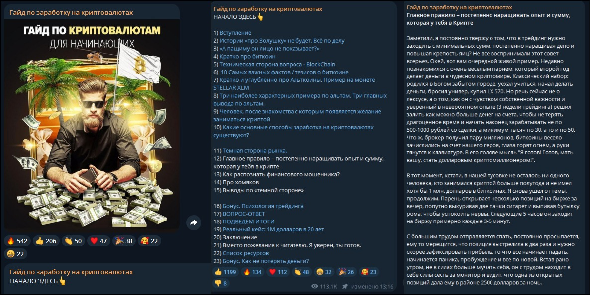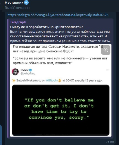 Ссылку на гайд вам даст «Наставник» сразу после того, как вы напишите ему в личку сообщение со словом «Гайд».Автор в личной переписке даст еще 2 ссылки, одна из которых перекинет на бот в Телеграме TryCrptBOT, он проведет краткий экскурс в криптотрейдинг: немного истории и мотивации вида «торгуй прямо сейчас» «Наставник» обязательно попросит обратную связь.