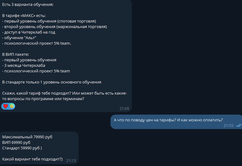 Цену обучения можно узнать только в личной переписке с трейдером. Он предлагает 3 тарифа: