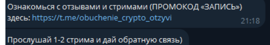 В открытом доступе у трейдера в каналах ничего нет, будь то телеграмм-канал Obucheniem или Cryptomto. Есть лишь один единственный пост с просьбой написать в личку.