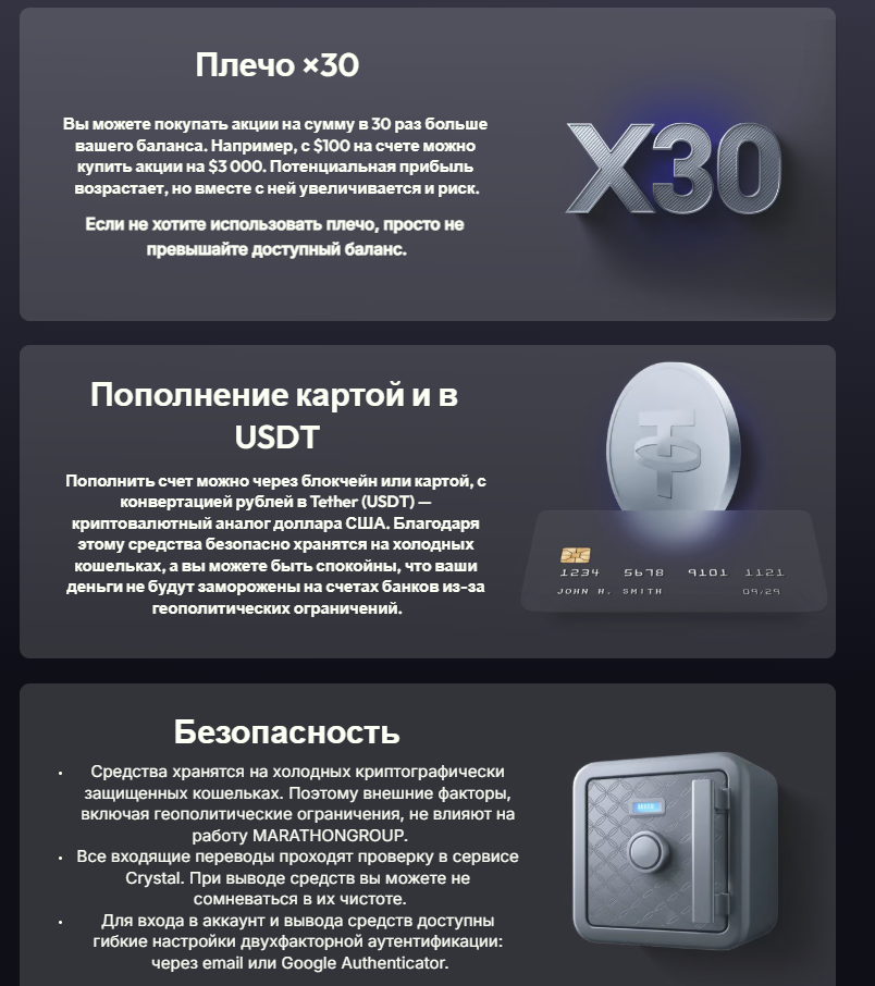Площадка Mobile MarathonGroupLte org рассказывает о своих преимуществах, среди которых можно найти большое кредитное плечо для трейдинга, возможность пополнить баланс и выводить средства через банковские платежные системы, карты и Usdt, а также безопасность хранения и надежные условия безопасности крипто-активов при пользовании сайтом.