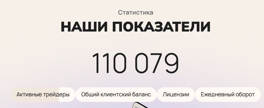 На главной странице сайта брокера присутствует блок со статистическими показателями. В нем, например, указано, что через терминал платформы торгует свыше 110 тысяч трейдеров.