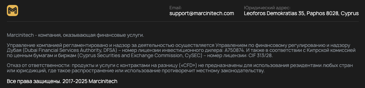 Marcini Tech — брокер, который начал работу примерно весной 2025-го года. Минимальная сумма, которую возможно внести на его депозит, составляет 100 долларов.