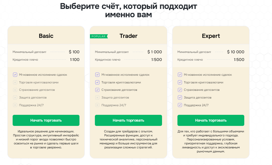 Например, для использования базового аккаунта нужно пополнить кошелек на сумму от $100. Типы счетов отличаются друг от друга по размеру кредитного плеча, а также качеству обслуживания и поддержки. Нет информации о спреде и взимаемых за торговлю комиссиях.