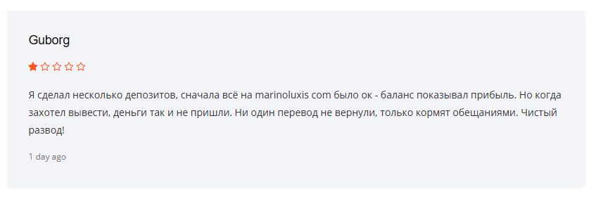 О сайте MarinoLuxis не так много отзывов в интернете, так как он существует относительно недавно. Мы смогли обнаружить некоторые комментарии, в которых проект обвиняют в мошенничестве.