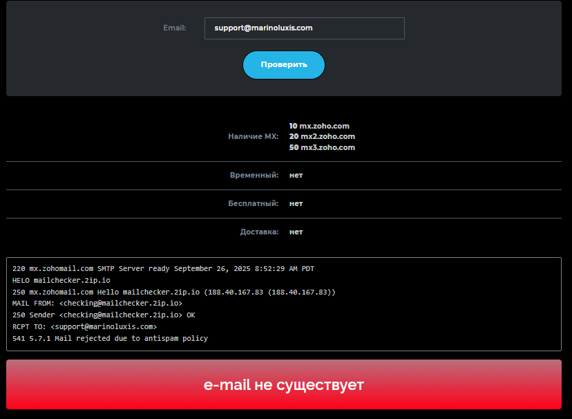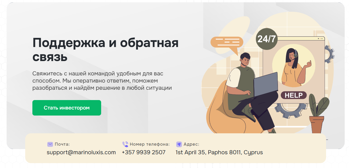 Также можно позвонить по номеру +357 9939 2507, написать на почту support@marinoluxis com. Мы проанализировали адрес и заметили, что его не существует.