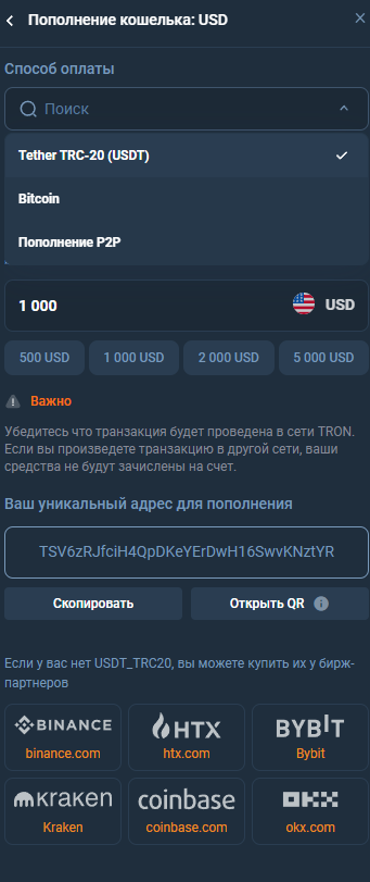 Пополнить баланс счета можно в криптовалюте, а также P2P переводом, как указано в личном кабинете.