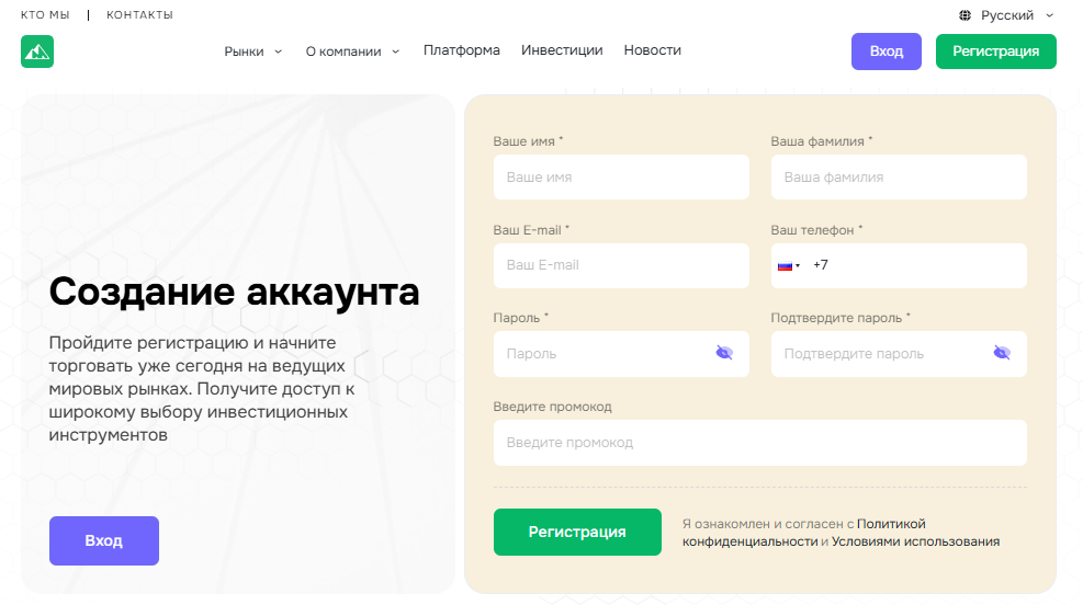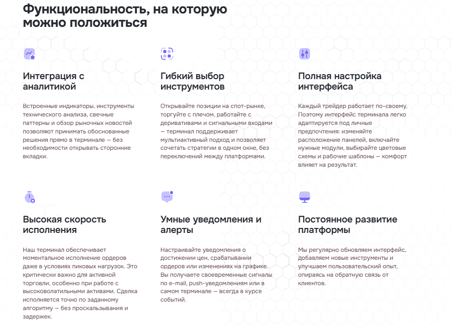 Утверждается, что брокер разработал собственный терминал, не связанный со сторонними компаниями. В описании сказано, что в рамках платформы интегрирована аналитика, есть гибкие инструменты и удобный интерфейс.