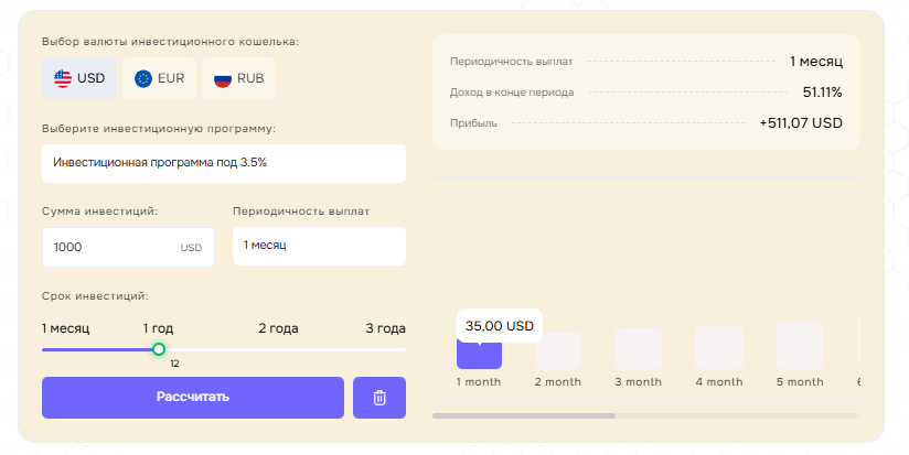 На сайте можно найти упоминания о возможности инвестировать в компанию, предусмотрен встроенный калькулятор.