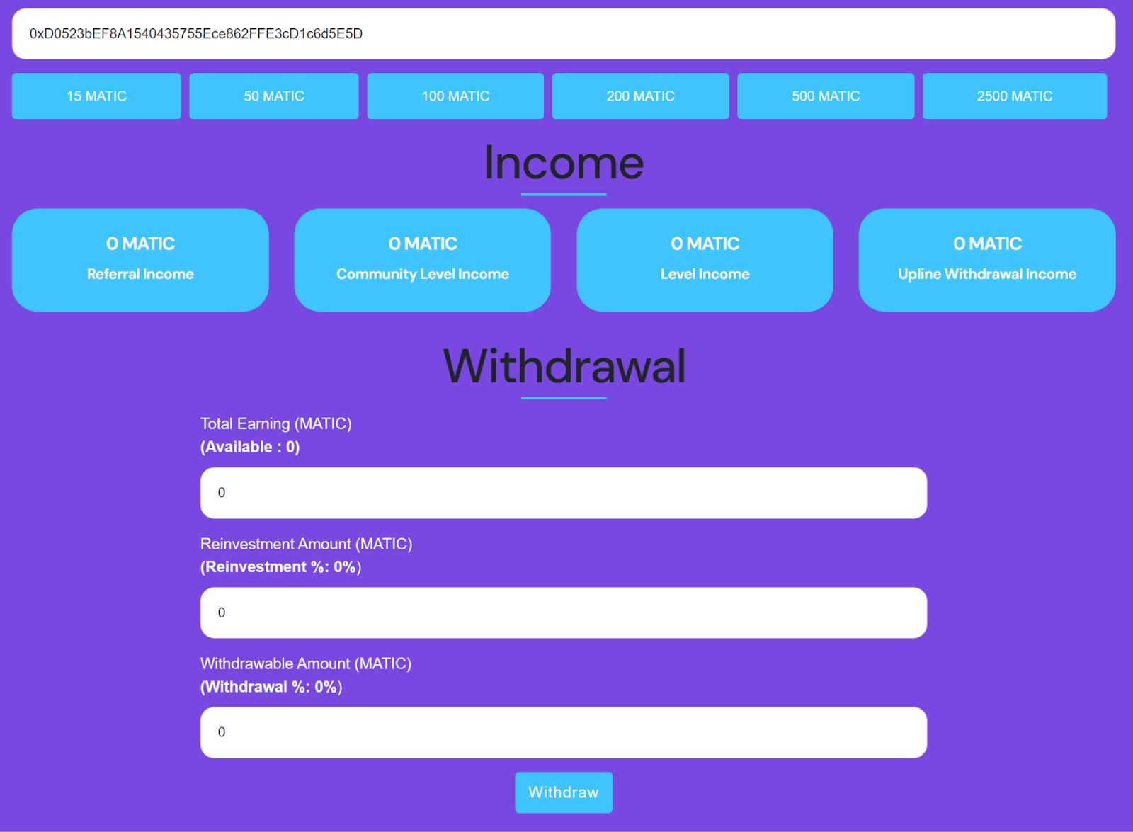 Для пополнения сета на Matic Invest предлагается использовать криптовалюту Matic. После перехода на официальный сайт приводится несколько вариантов для внесения 15, 50, 100 и другого количества токенов. Для проведения транзакции аферисты предлагают ввести данные кошелька в специальное поле и таким способом подключить его к проекту.