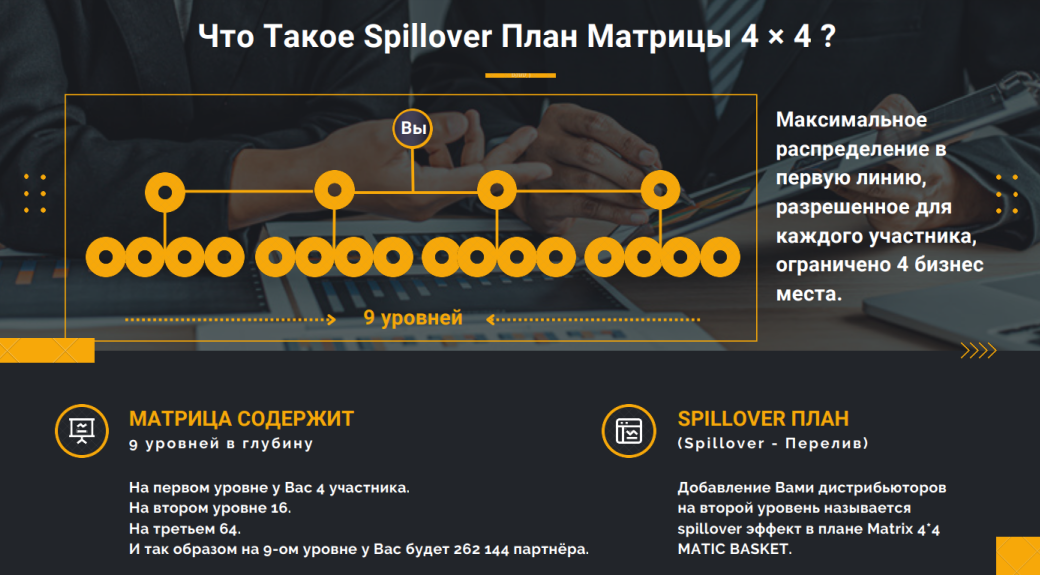 В распоряжении пользователей есть некая матрица 4х4. Она содержит девять уровней в глубину, На 1-м предусмотрено место для 4-х участников, на 2-м — для 16-ти, на третьем — для 64-х и т. д. В результате на 9-м уровне у человека уже будет свыше 262 тыс. партнеров.