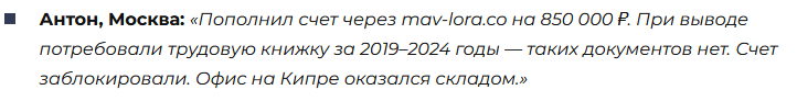 Найденные отзывы о брокере mv lora link отрицательные. Пользователи говорят о трудностях с выводом, требованиях, которые просто невозможно выполнить. Также есть жалобы о блокировках счетов без объяснения причин, списывании денег.