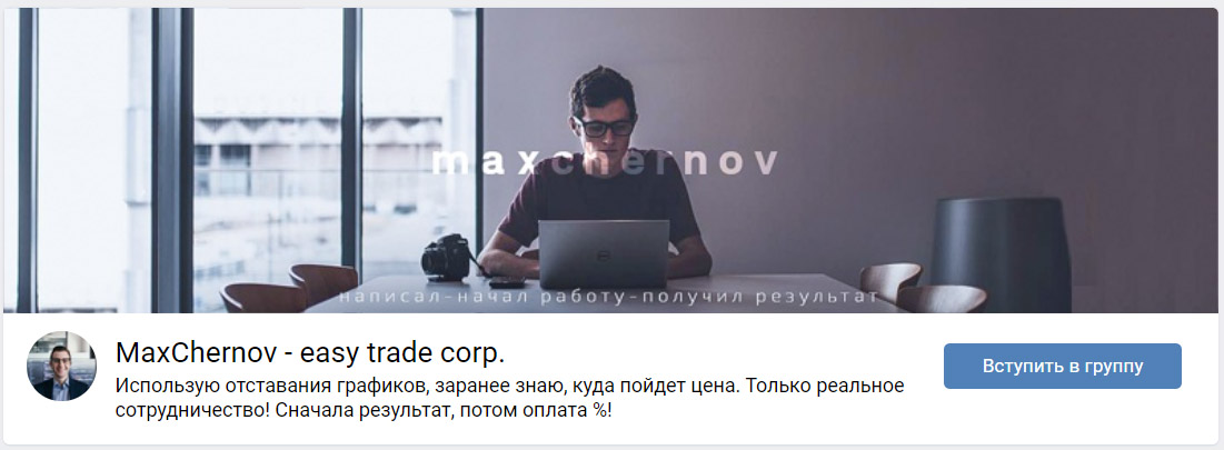 Max Chernov — трейдер, предлагающий бесплатное обучение и заработок на торговле бинарными опционами. Предложения для учеников Макс размещал в сообществе в сети VK под названием Easy Trade Corp. Для притока аудитории владелец приобретал рекламу, где рассказывал о преимуществах сотрудничества. В статье мы рассмотрим предложения частного трейдера и проанализируем отзывы о нем, чтобы понять, можно ли доверить свои средства Максиму Чернову.