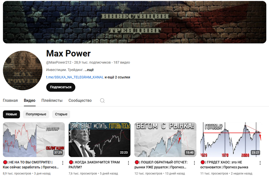 Макс Пауер или MaxPower212 – это трейдер и инвестор, который ведет активную публичную деятельность в YouTube и Telegram. Для привлечения внимания к своей персоне он часто прибегает к методам клик-бейта и созданию хайпа вокруг себя. В заголовках многих его роликов можно встретить сообщения о крахе мировой экономики или апокалипсисе на финансовых биржах.