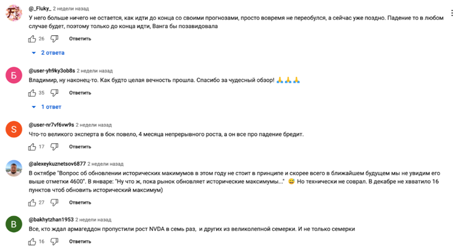 Как мы видим, пользователи скептически смотрят на прогнозы и инвестиционные рекомендации автора. Трейдер часто пытается привлечь внимание сообщениями о грядущем финансовом крахе. Однако его подписчики часто пишут, что дела на рынке обстоят иначе.