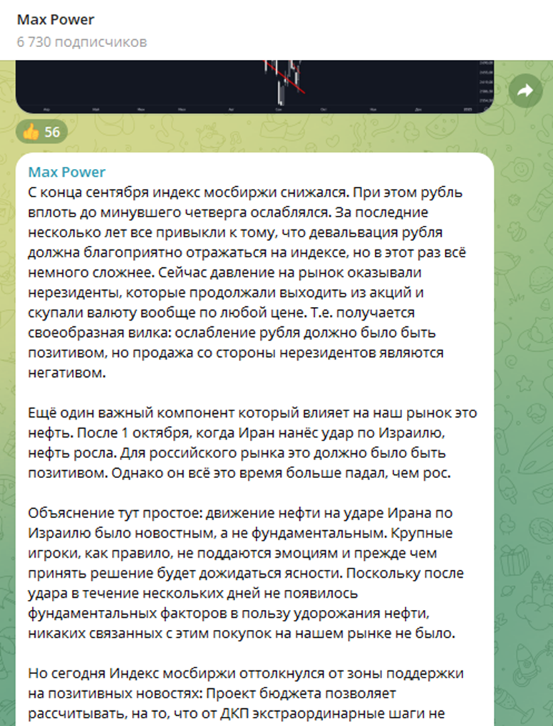 Телеграмм канал трейдера так и называется Max Power. Его можно найти по ссылке Ssilka na telegram kanal. На ноябрь 2024 года, на ресурс подписано 6 730 подписчиков. Публикации в среднем просматривает от 4 до 9 тысяч человек. Половина бесплатных постов — это просто ссылки на YouTube. Остальные – это по большей части полотно текста с мыслями автора.
