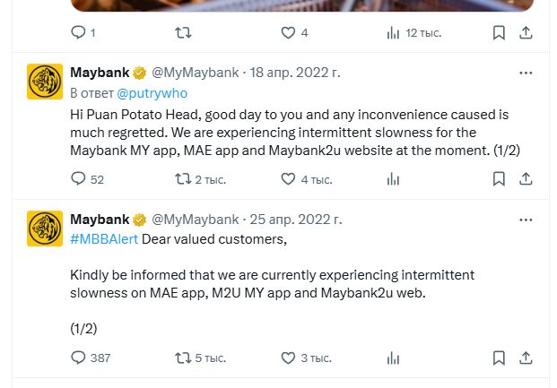 Брокер также проводит консультации в офисах с 9:00 до 18:00. У Maybank есть несколько страниц в соцсетях, в том числе на Ютубе (maybankvideos) и в Икс (MyMaybank).