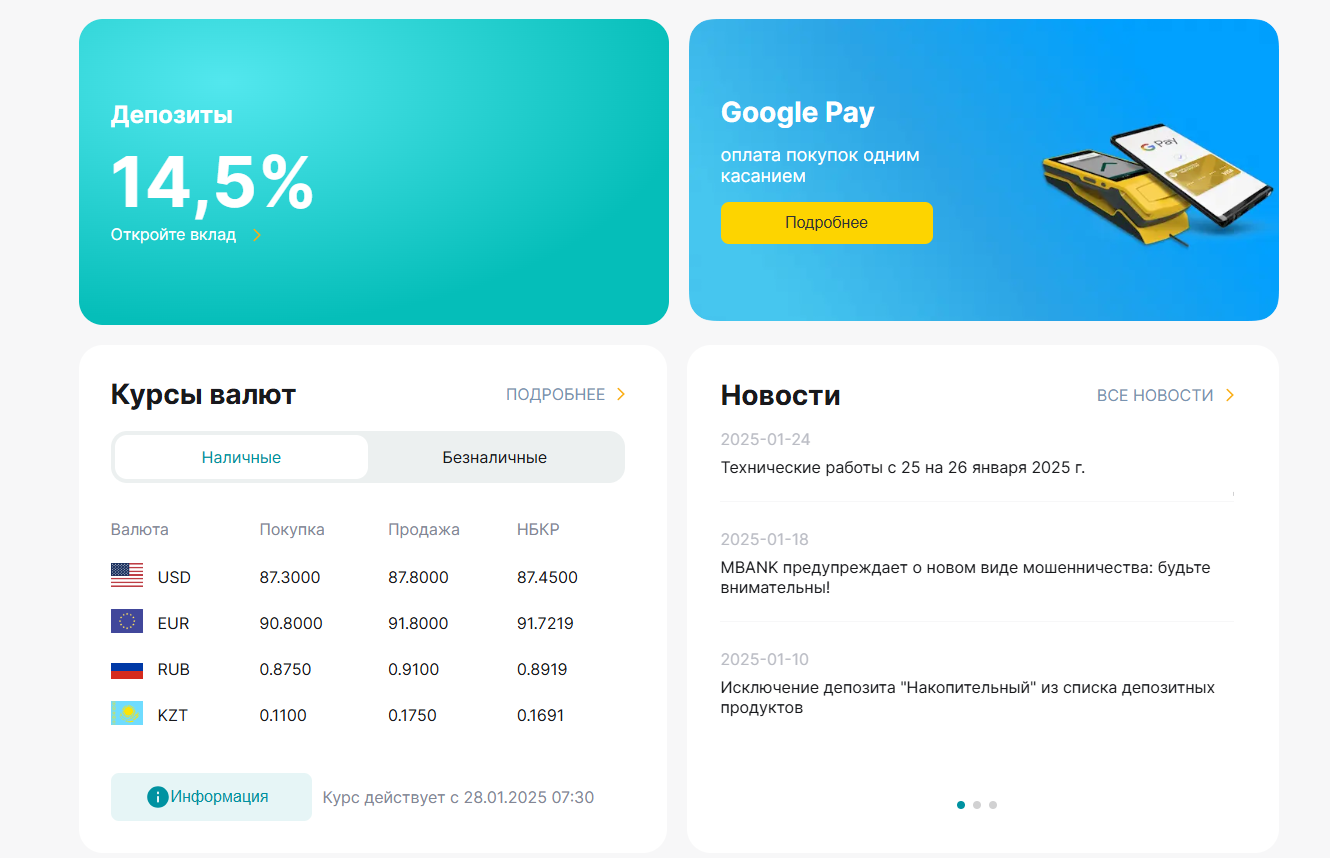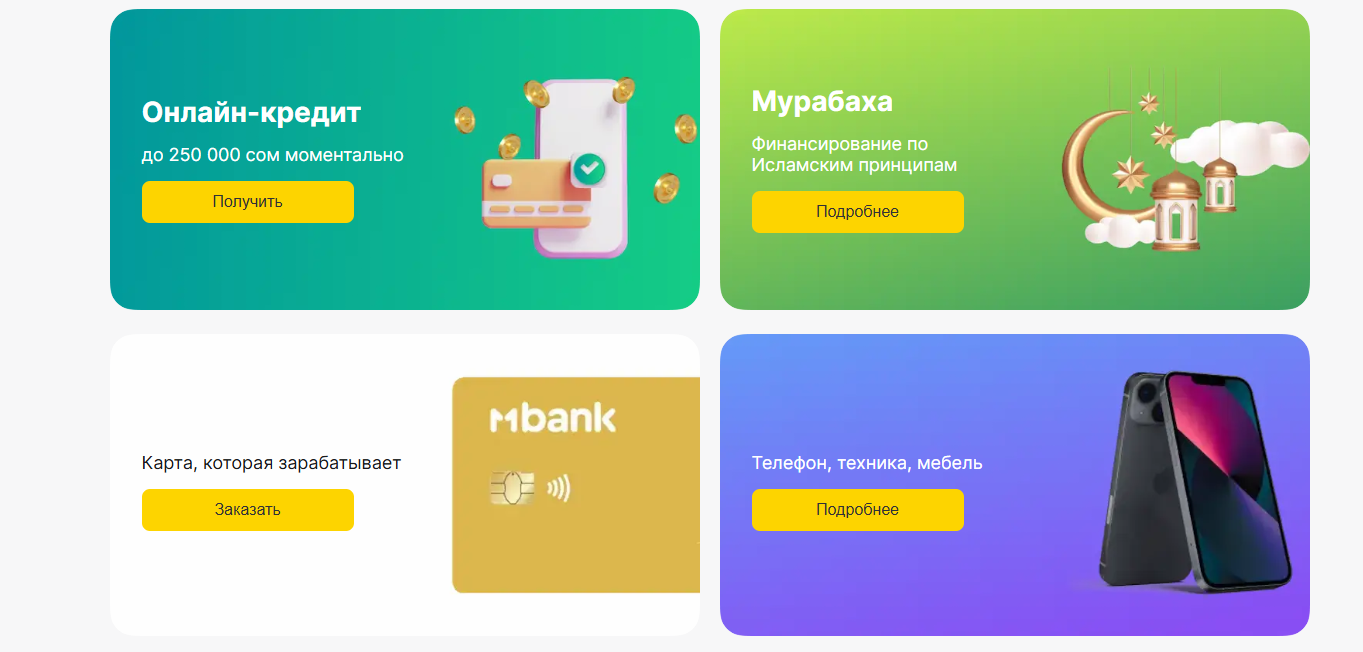 «Мбанк КГ» предлагает множество условий, для частных и корпоративных клиентов. Центральный офис — ул. Тоголок Молдо, 54а Бишкек, Кыргызстан, 720033. Лицензия №014 НБ КР. Депозитные услуги: