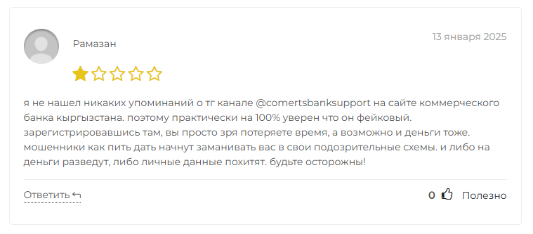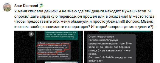Вот некоторые предположительные схемы мошенничества аккаунтов с именами? Comertsbanksupport, Mbankkgz и Cbkkg bot. О них сообщили пользователи. Запрос паролей и личной информации: