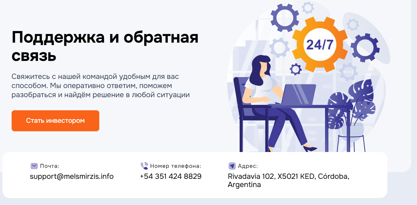 Для связи с поддержкой указана почта support Melsmirzis info и телефон, который относится к Кордове. Офис компании находится в Аргентине. Домен зарегистрировали 26 января 2026 года. Однако на сайте уверяют, что проект работает с 2017 года.