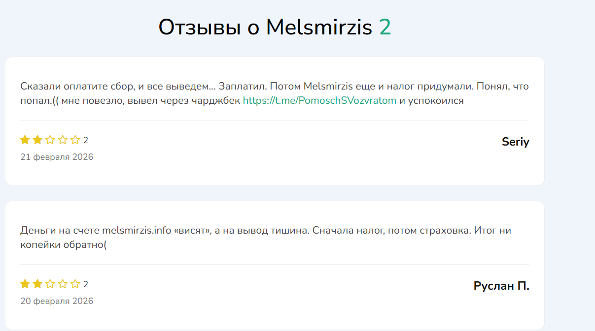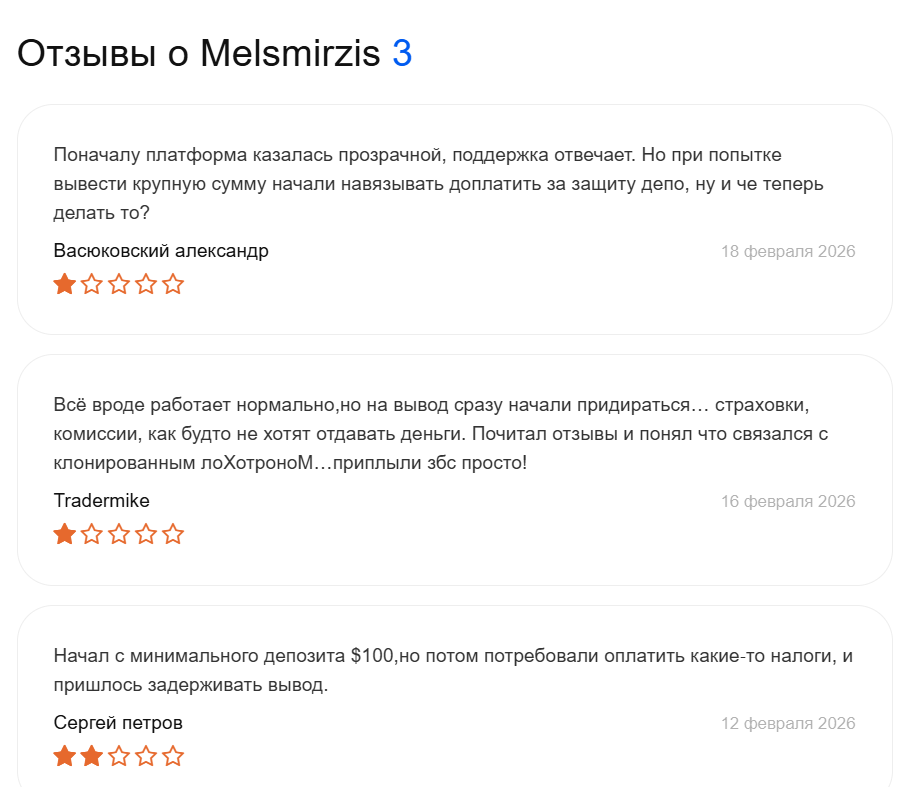 Редакция нашла много негативных отзывов о Melsmirzis. В них люди описывают одну и ту же схему. Сначала клиенты пополняют счет, а платформа показывает прибыль. Однако как только участники пытаются вывести деньги, поддержка перестает отвечать.