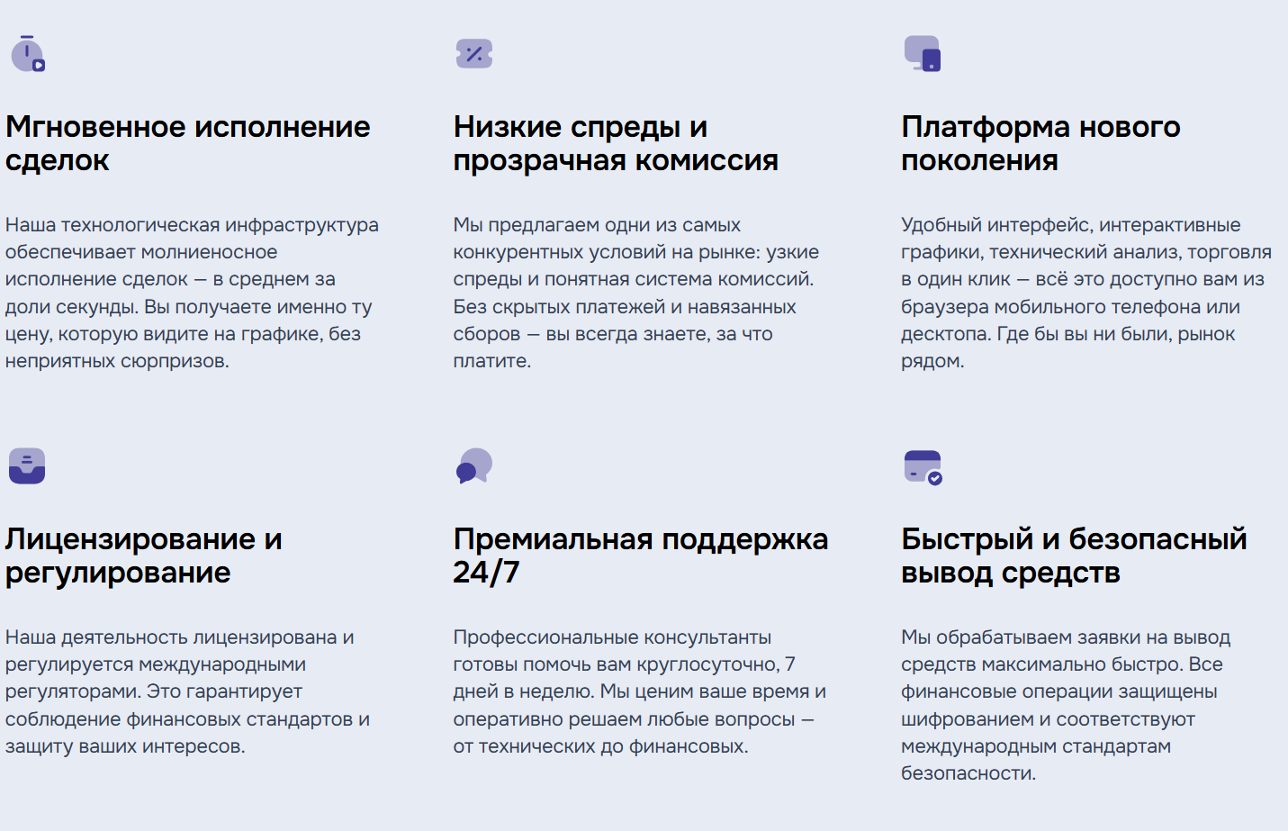 Платформа работает без обязательной установки дополнительного ПО. Предлагаются интерактивные графики с применением индикаторов, инструментов анализа и функции торговли. Доступны три торговых счета: