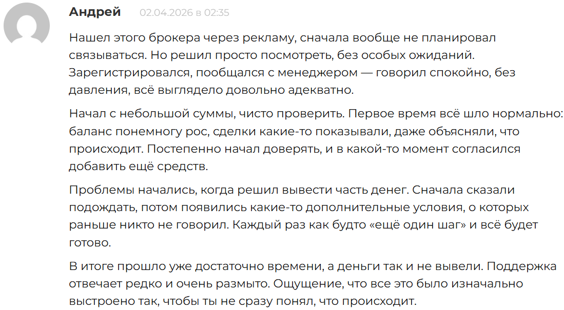 Судя по тому, что сообщают клиенты, брокер практикует банальный развод на деньги. Он позволяет клиентам сделать депозит, а затем не разрешает выводить вложенные деньги. Обращения в поддержку не дают результата: она отвечает редко и каждый раз обещает разобраться в ситуации, но ничего не происходит.