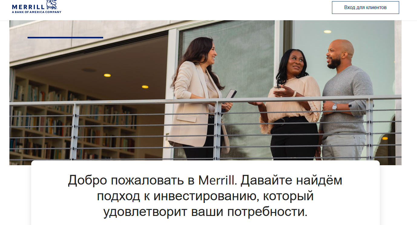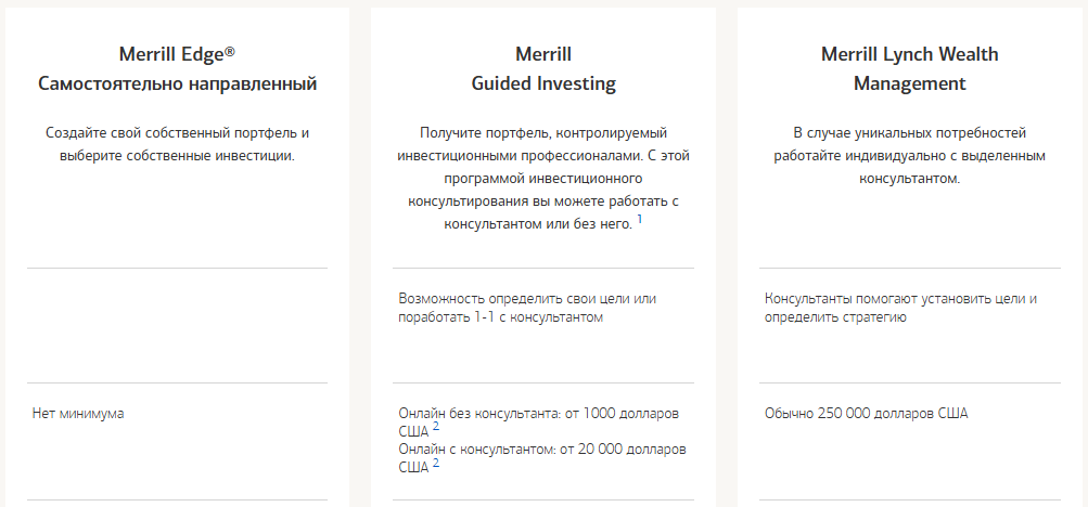 Компания предлагает три варианта работы. Первый – Merrill Edge для самостоятельной торговли. Второй – Merrill Guided Investing с управлением от профессионалов. Третий – Merrill Lynch Wealth Management для богатых клиентов.